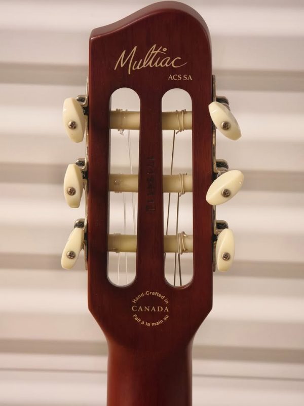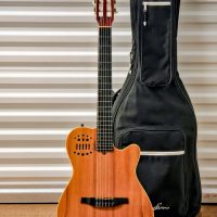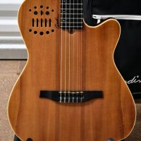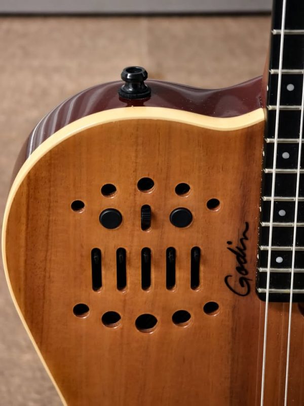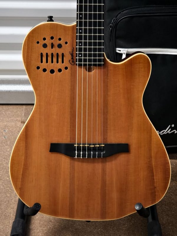 A premium Godin ACS SA Koa HG electro-classical guitar. Features a stunning koa high-gloss top, chambered body for comfort, nylon strings for warm tone, and synth access (SA) capability. Perfect for live performance and recording.
